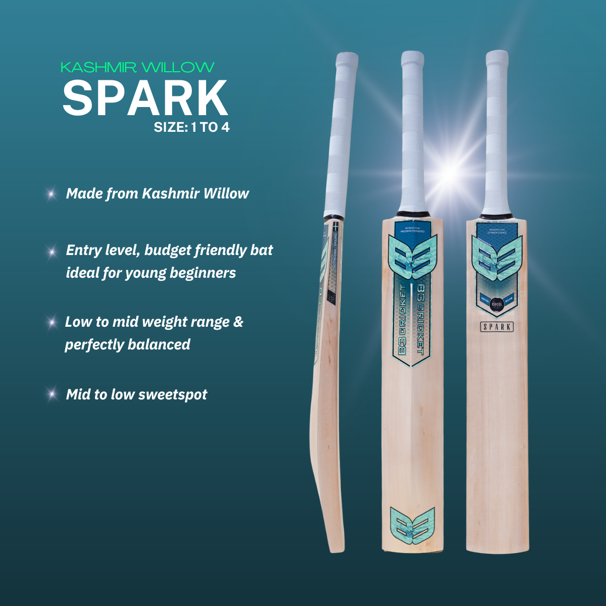 Made from high-quality Kashmir Willow, the Spark cricket bat is an excellent budget-friendly option for young cricketers just starting their cricketing journey. Designed with beginners in mind, the Spark provides a solid balance between performance and durability, offering great value for those learning the basics of the game.